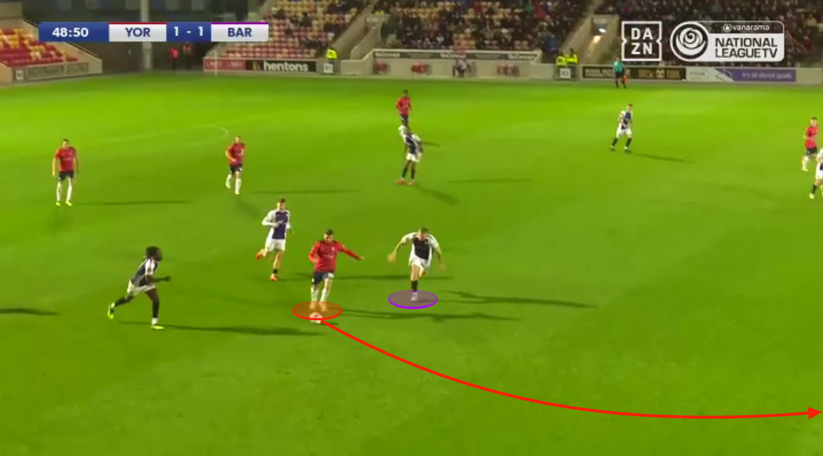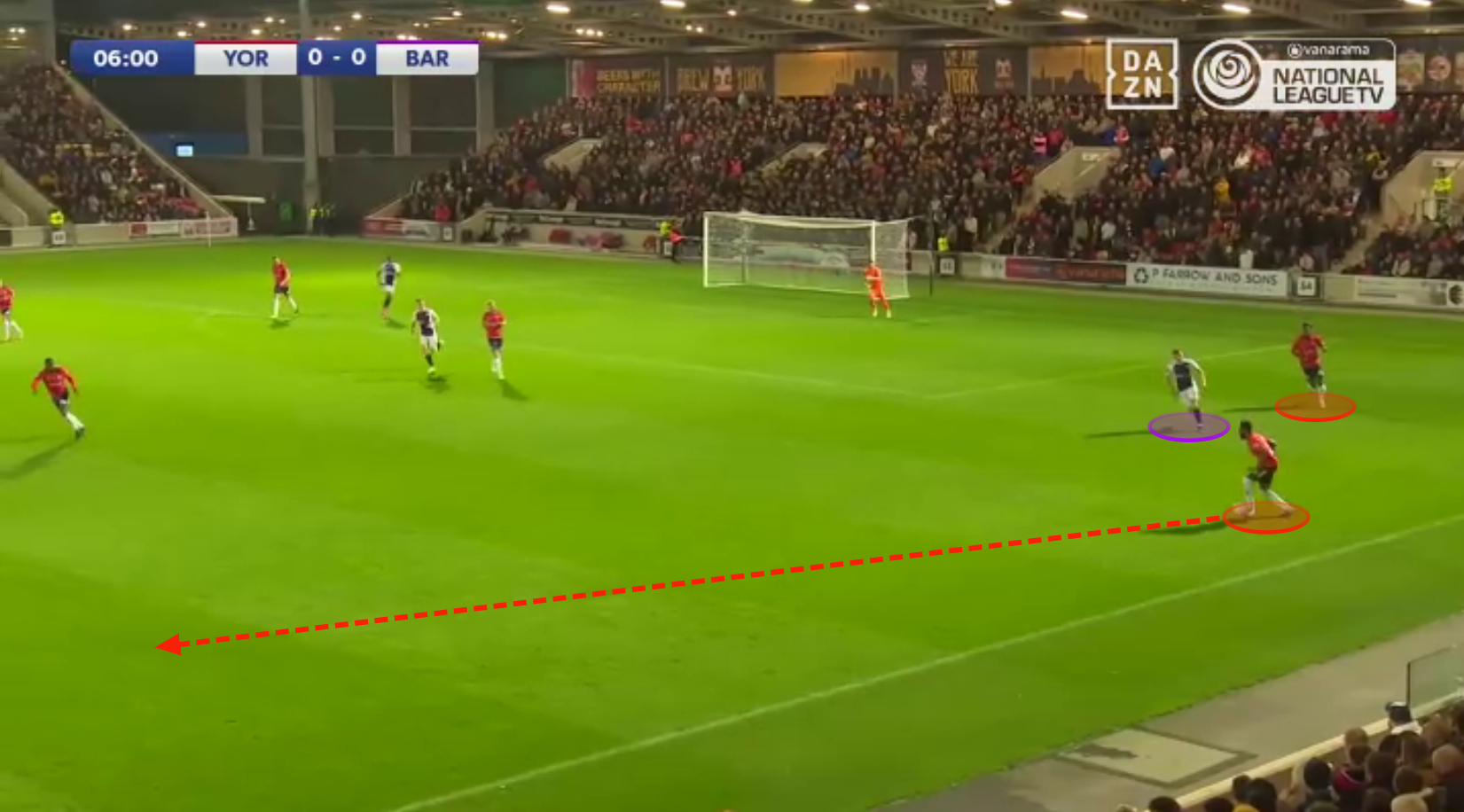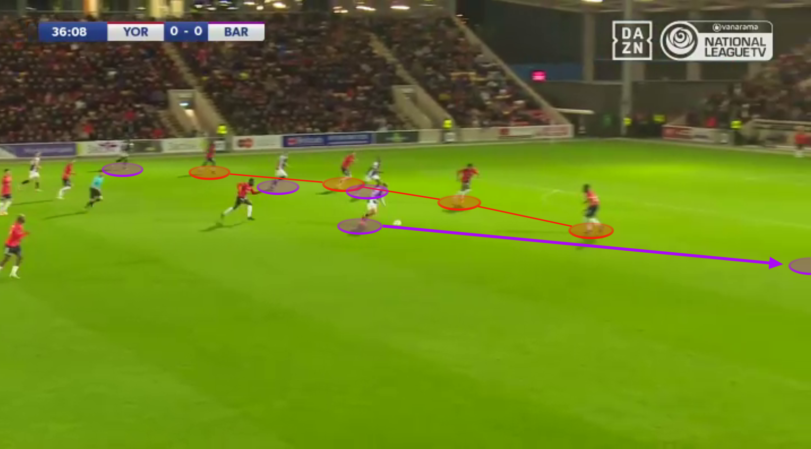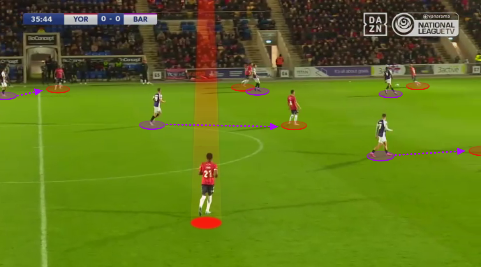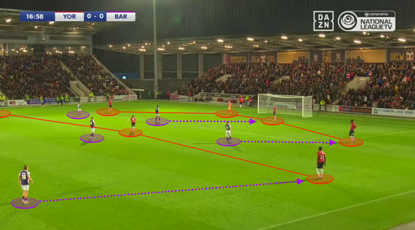 Additionally, Barnet required their wing-backs to cover a lot of ground to ‘jump’ to press York’s full-backs. However, if their wing-backs were unable to ‘jump’ they could be outnumbered 2v1 on the sides, and York could progress.