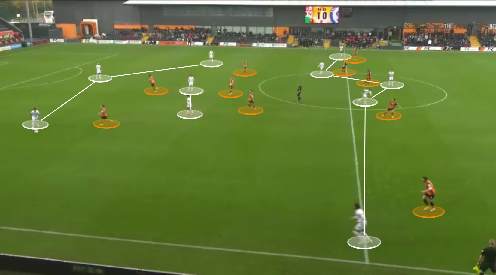 It’s important to note, however, that Barnet don’t always set up with this out-of-possession approach. They often transition into a man-to-man press from a zonal one, matching up down the sides whilst also having a +1 in the last line. This gives them the same benefits of a man-to-man press, but also allows them to have extra security in defence.