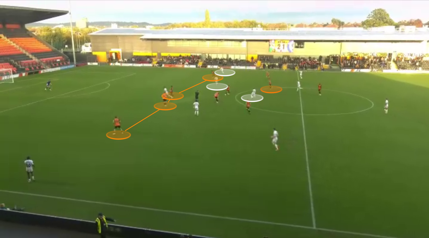 Here’s one final example. Kenlock had once again stepped into midfield to press, which created space within Barnet’s defensive line. A through pass was played in-behind and, following a cut back, Tarryn Allarakhia’s shot hit the post.
