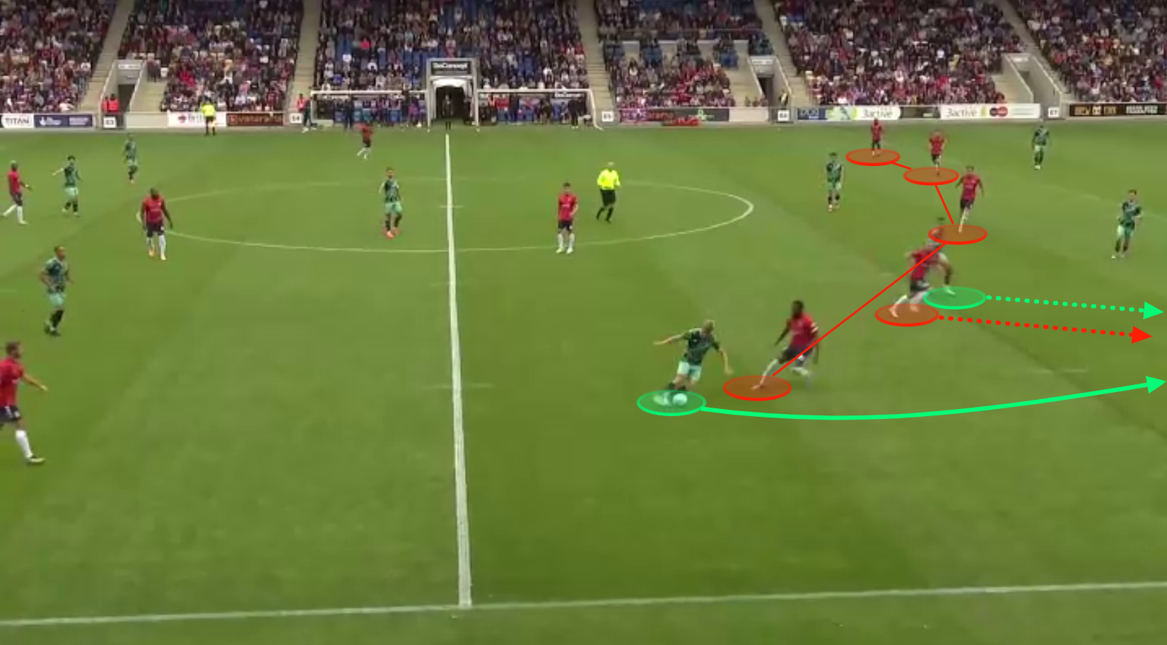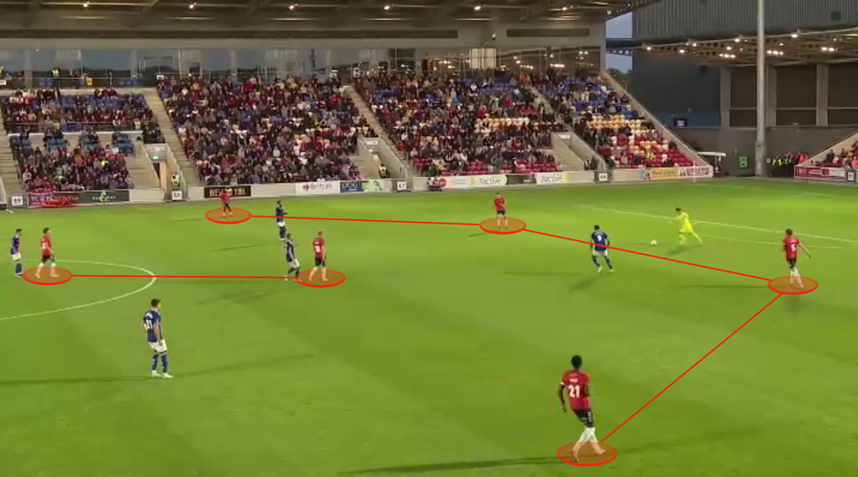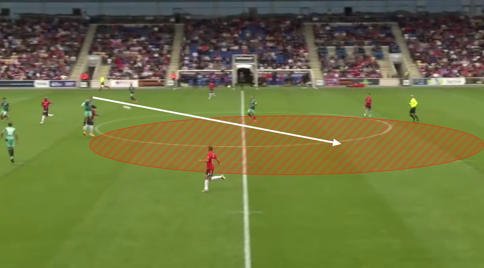 However if sides task their centre-backs with man-marking Pearce and Armstrong/Aguiar, they can easily be dragged out of position and leave gaps in their defensive line. We can see this last point in action within the below image.
