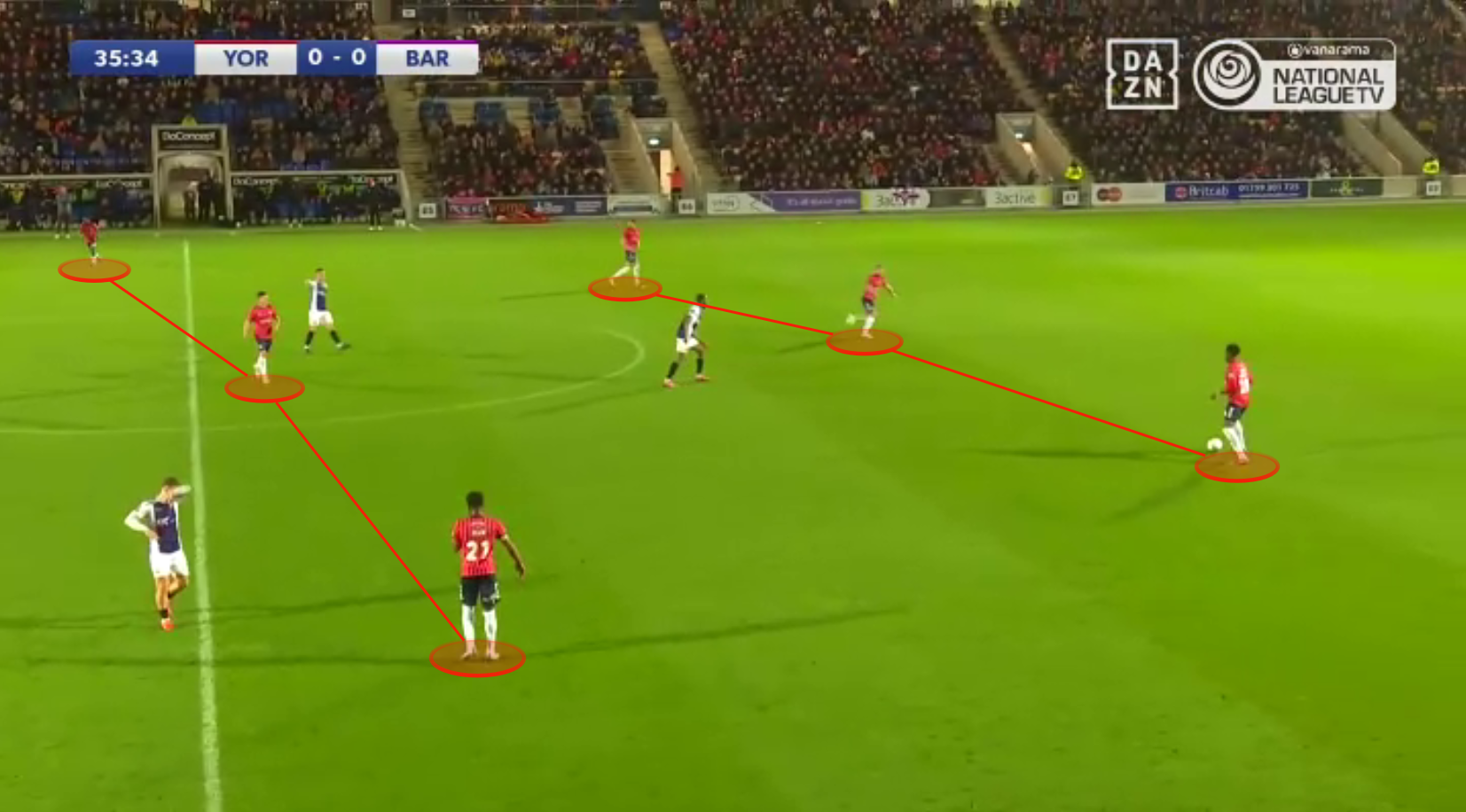 This pressing structure of York’s is seen below. In fact, this actually led to York’s third and final goal of the match against Barnet in a 3-1 victory.
