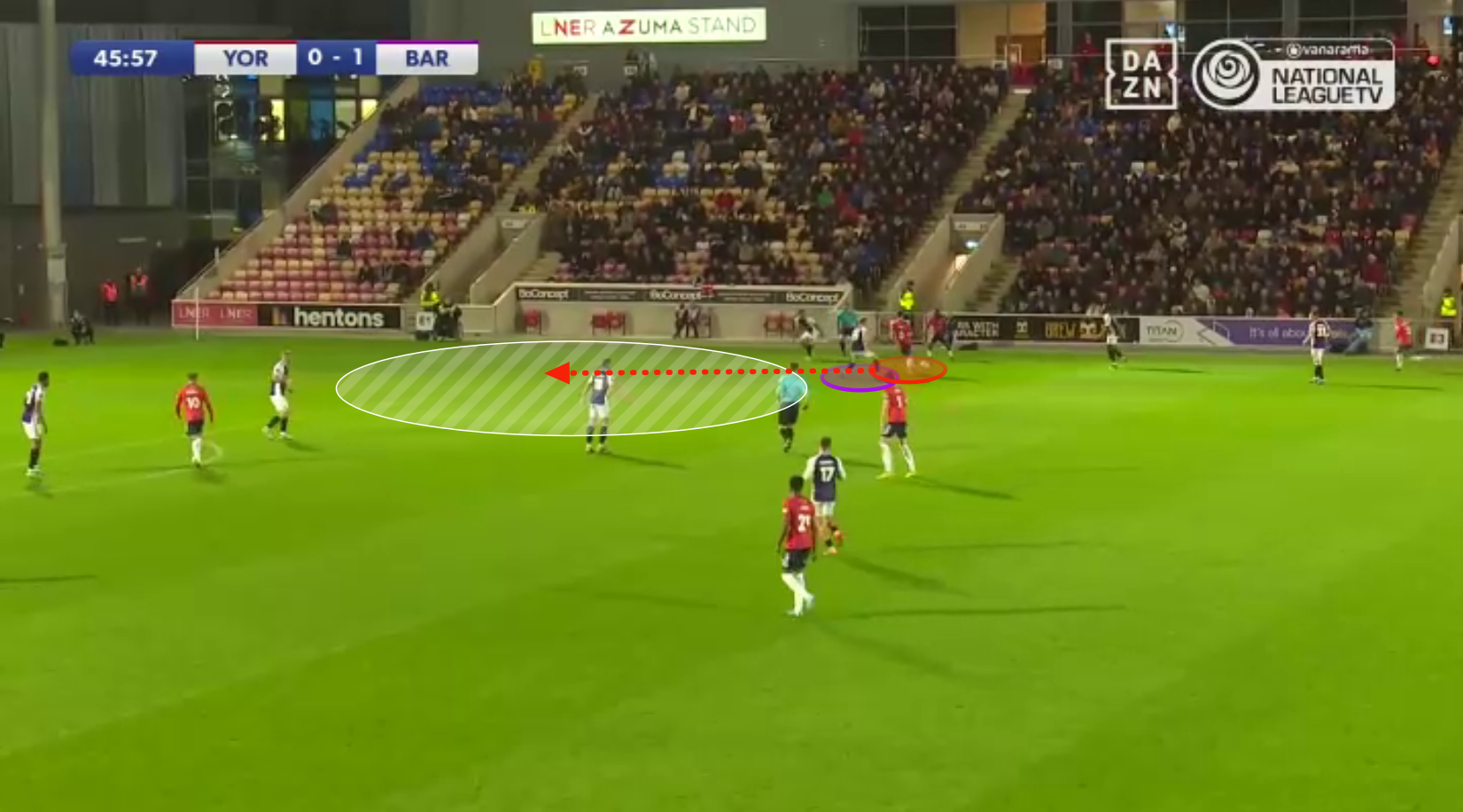 As we can see below, York’s left-back, Cameron John, had been forced to press forwards. Batty had to track the run from deep, but this was difficult for him to do so. As a result, the attacker could easily meet the through pass and cross the ball into the penalty area.