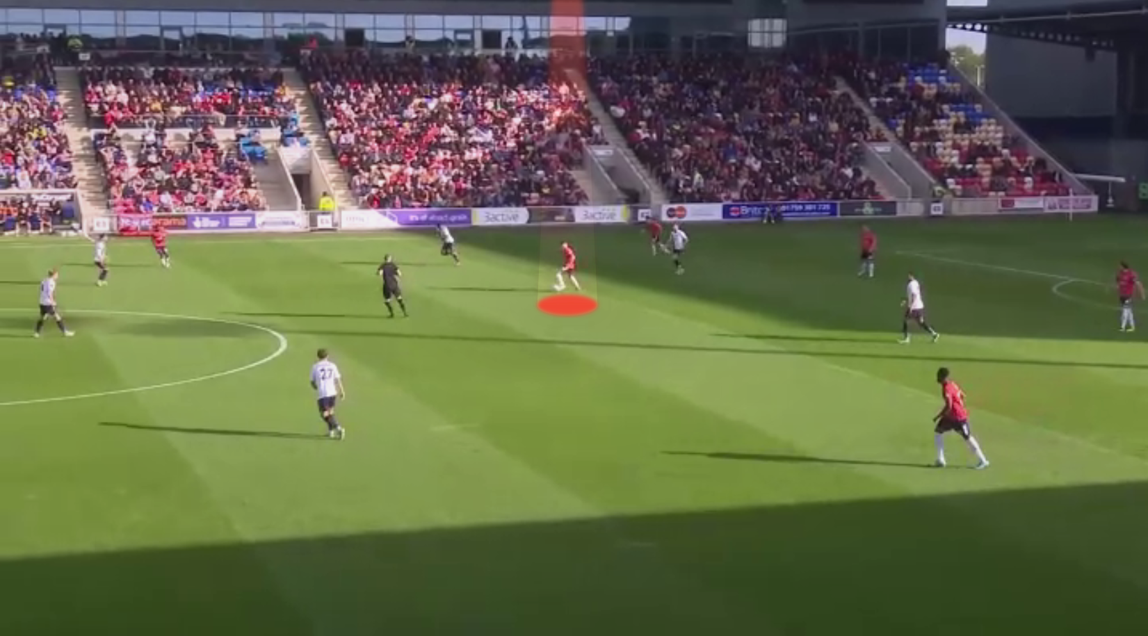 Versus Barnet, who pushed their wing-backs high and wide to stretch the pitch, a #10 was found free between the lines. Barnet managed to create a wide overload with their right wing-back. This led to Barnet’s goal.
