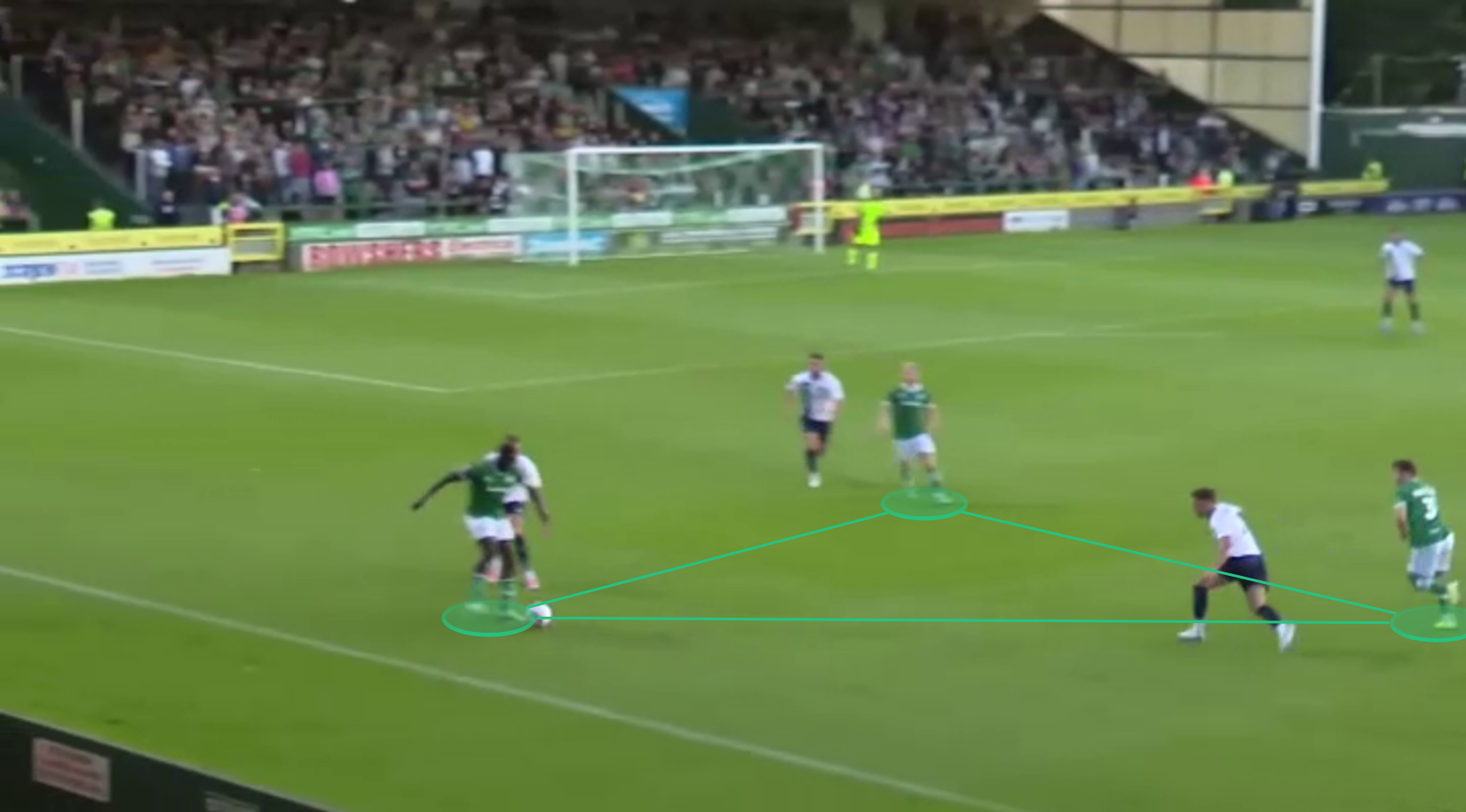 First up, against Ebbsfleet United. One of Yeovil’s forwards, Frank Nouble, had the ball on the left touchline, with Josh Sims and the left-sided centre-back, Alex Whittle, helping to form a triangle (below). This allowed them to combine and interchange positions. Whittle made an underlapping run, was found by Nouble, and then crossed into the penalty area. His cross found its way to Brett McGavin, who finished.