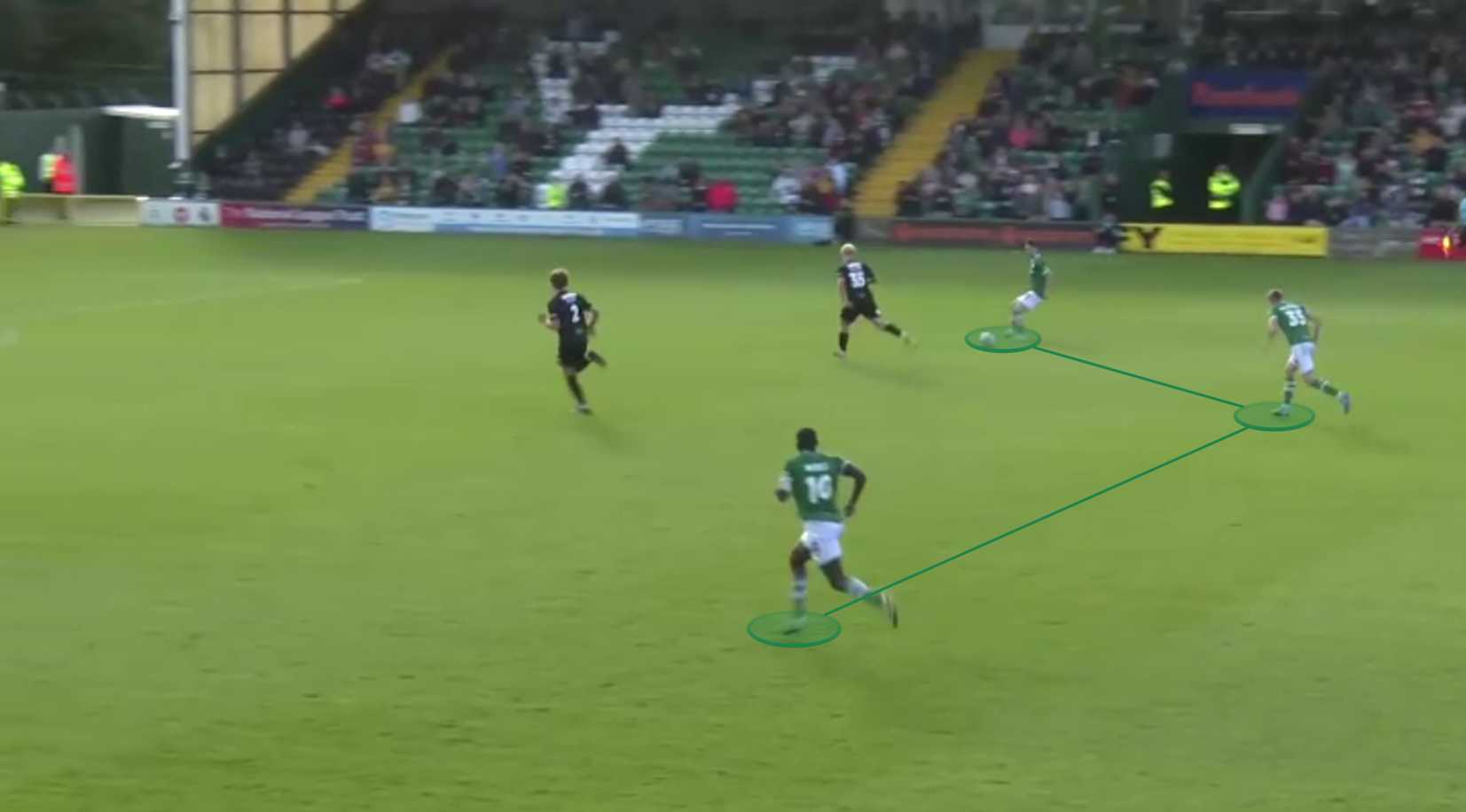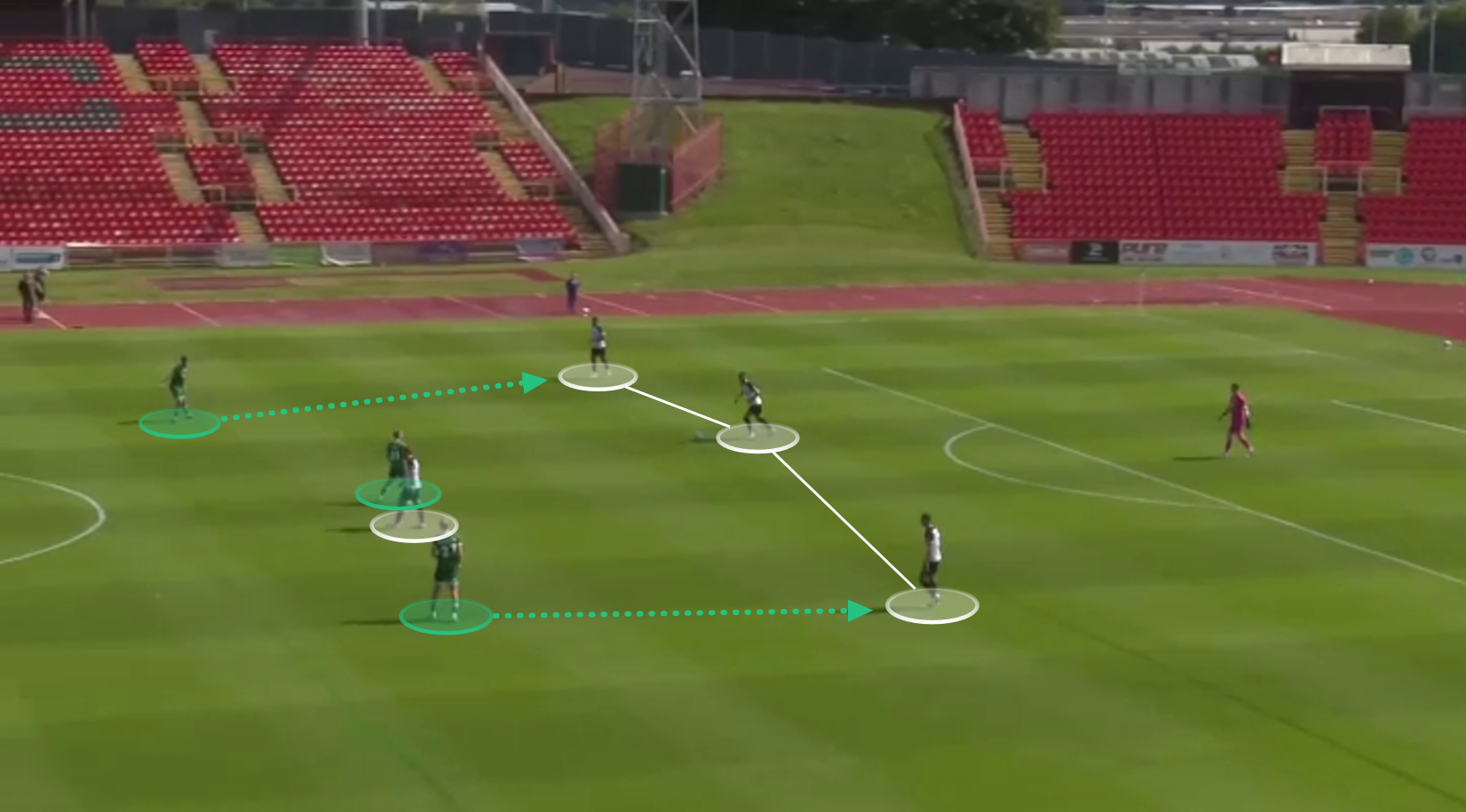 And here, versus Maidenhead United. Nouble dropped slightly deeper into the midfield from the last line of attack. One of Maidenhead’s centre-backs followed him, which created space in-behind the defensive line for the centre-forward, Aaron Jarvis, to run into. Nouble played a through pass towards Jarvis, as we can see below, who scored.