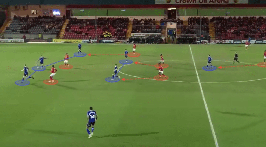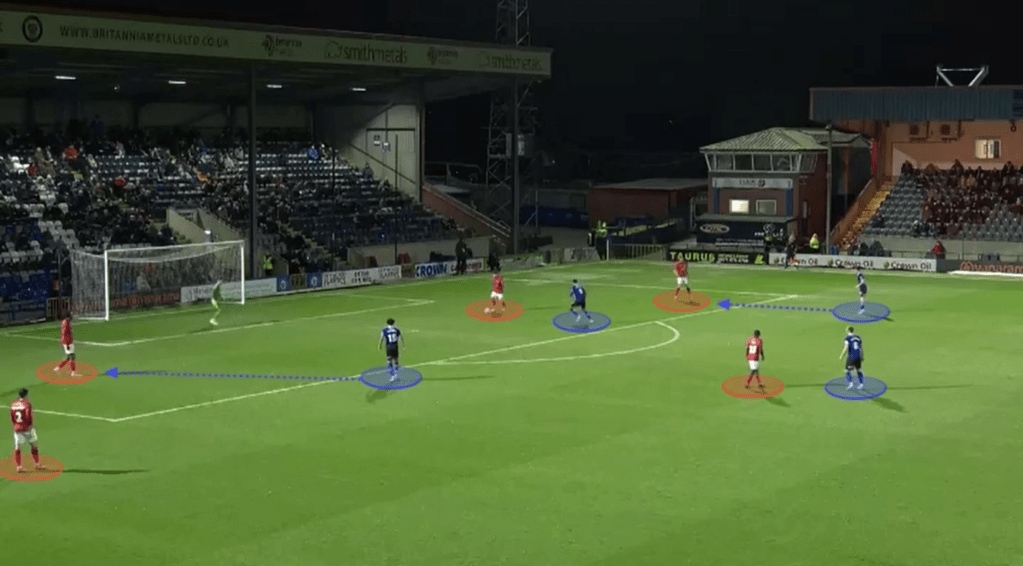 One of my major criticisms this season with McNulty’s side is their over-persistence with ‘playing out’ from defence, even when man-to-man pressure is applied – which can be difficult to play through.