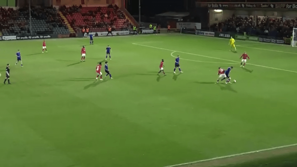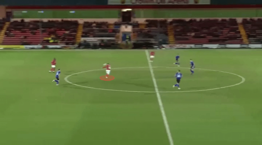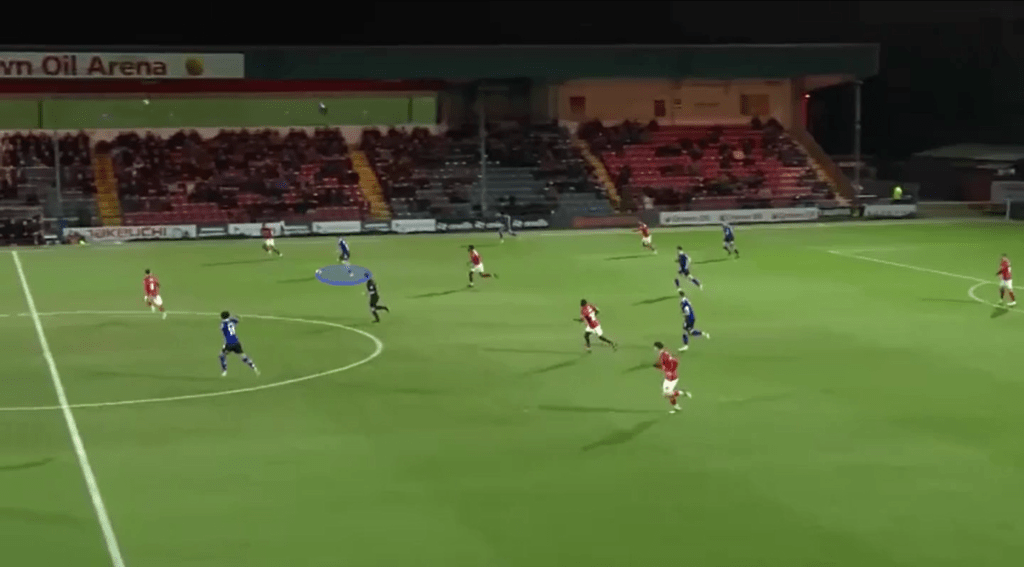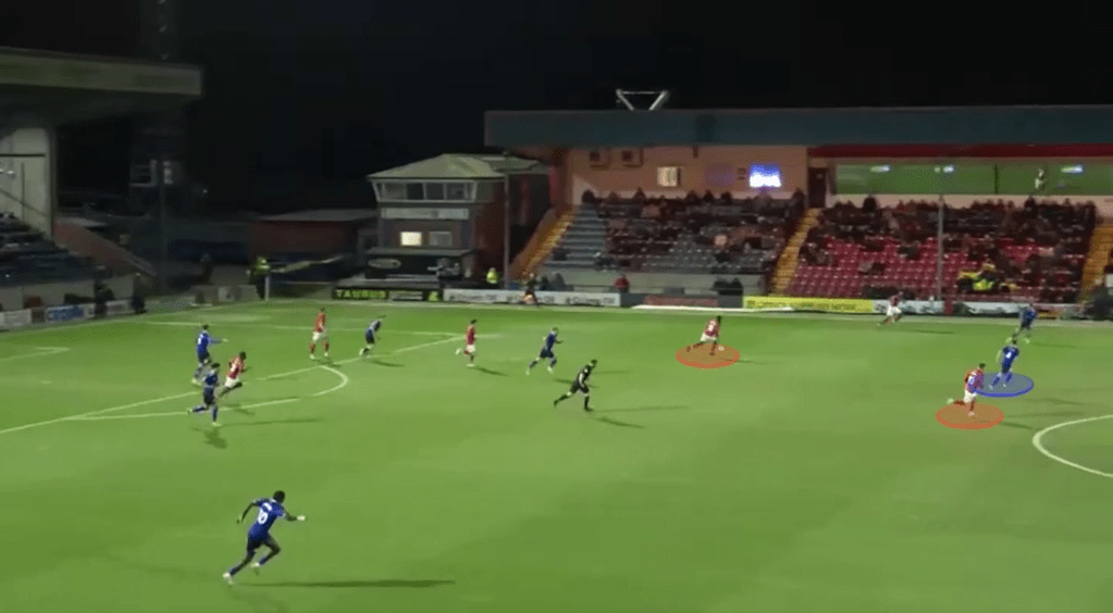 However, Rochdale did have some success with breaking York’s press. With York’s creating 1v1 battles all over the pitch, if Rochdale won these duels, they could progress and break at speed. Additionally, if Rochdale managed to find one of their #10’s when they went untracked by either Hunt or Fagan-Walcott, they could find space and attack the space that York’s press left behind.