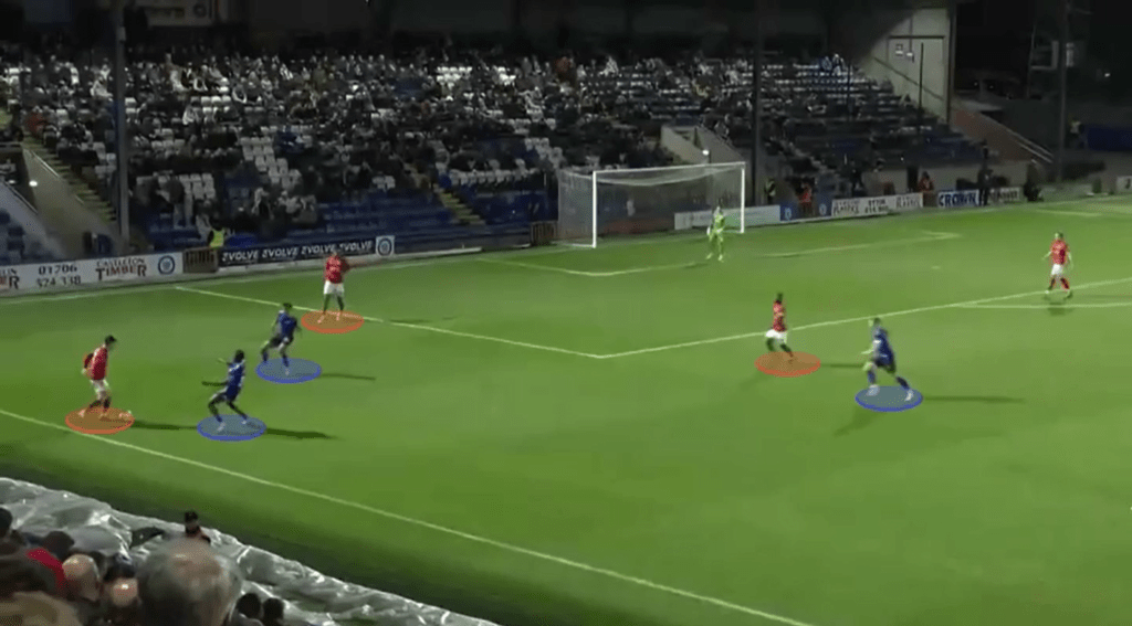 The home side built play in their usual 3-2-5 shape. Rochdale’s goalkeeper, Sam Waller, was behind a back-three of Jack Kingdon, Liam Hogan and Sam Beckwith. Ryan East and Harvey Gilmour were in the pivot, with their wing-backs, Tobi Adebayo-Rowling and Jili Buyabu, pushed high & wide, either side of their front-three, consisting of Connor McBride, Kairo Mitchell and Leon Ayinde.